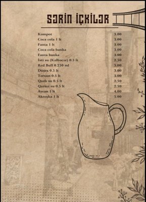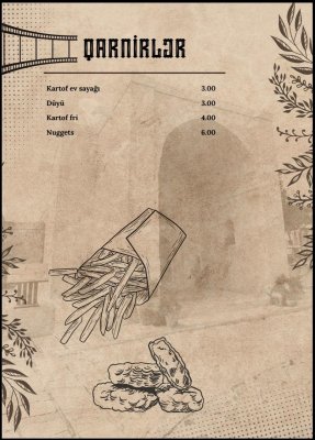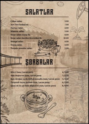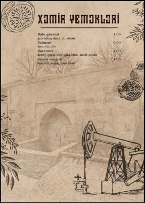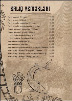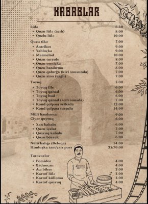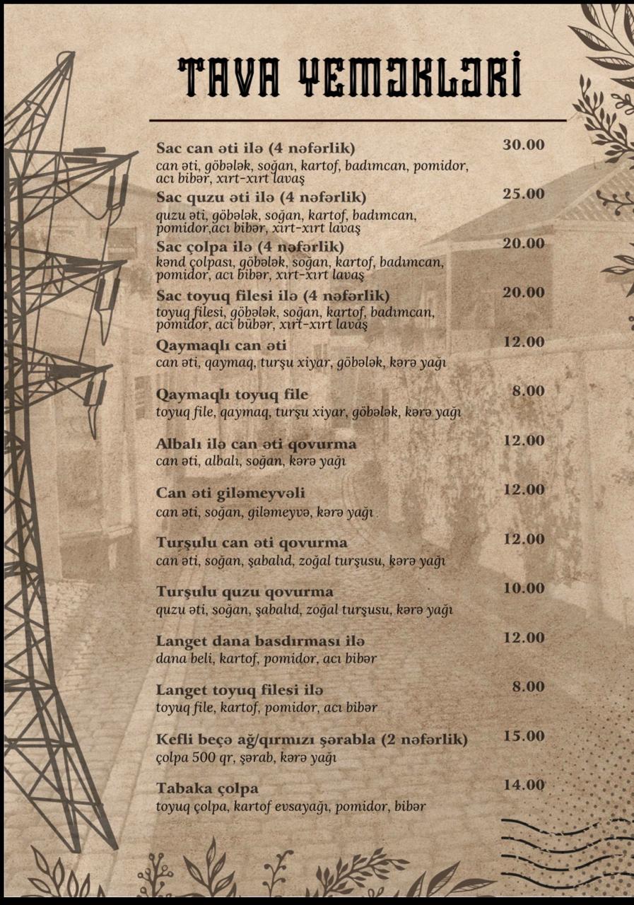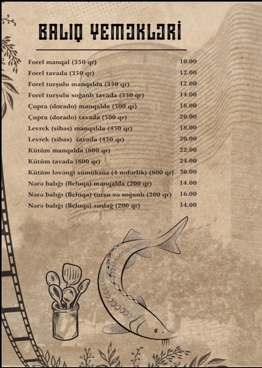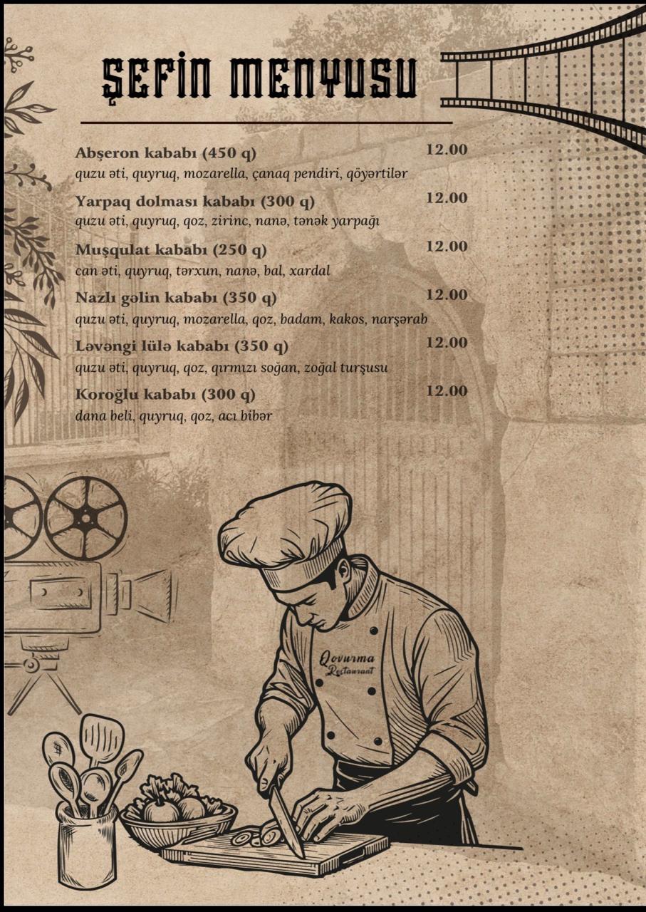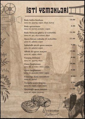 Qovurma Restoranın menyusu zəngin və fərqlidir. Dünya kabablarının ən seçilən növləri burada peşəkar aşpazlar tərəfindən hazırlanır. Hər təam yüksək keyfiyyətli məhsullardan hazırlanaraq qonaqlara təqdim olunur.